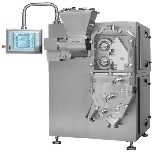 辊压连续干法制粒是应用于制药、化工和生命科学行业的成熟工艺。是一种将干燥粉料通过螺杆输送、压辊挤压、薄片破碎、旋转强压等过程从而制成颗粒的设备。干法制粒机按螺杆往压轮输料的方式可分为水平进料式和竖直进料式,按整粒系统的数量分为一级整粒和两级整粒。
